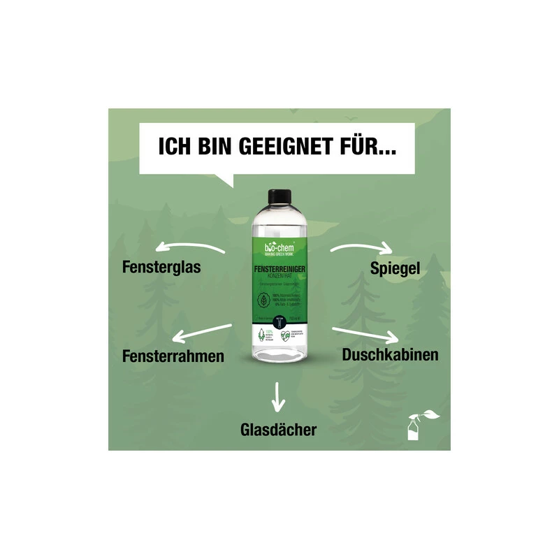 Mit dem bio-chem Fensterreiniger Konzentrat reinigst Du schnell trocknend und hinterlässt einen strahlenden Glanz auf Deinen Glasscheiben. Das speziell entwickelte Konzentrat eignet sich perfekt für die Anwendung mit einem Fenstersauger oder Fensterputzer. Aber auch eine manuelle Anwendung in Verbindung mit einem Fensterwischer oder Fensterabzieher geht Dir mit dem Mittel ganz leicht von der Hand. Deine Nachbarn werden Dich um deine streifenfreien und blitzesauberen Fenster beneiden!
