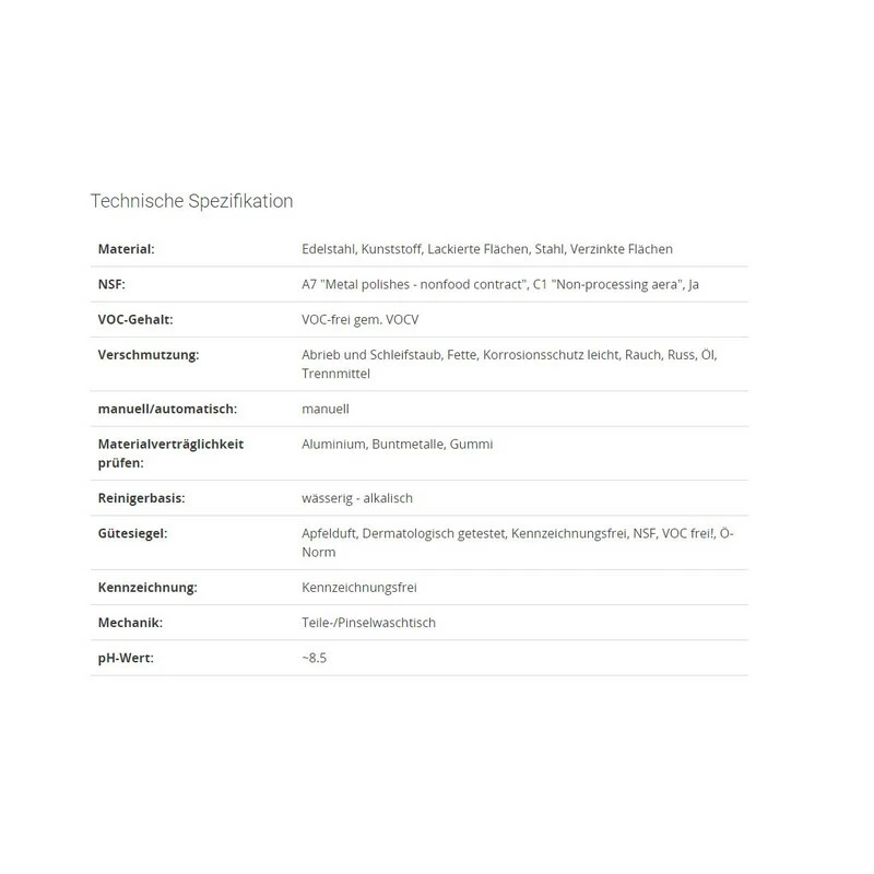 Das Medium greift die Oberflächen der zu reinigenden Teile nicht an und spezielle Korrosionsinhibitoren gewähren einen temporären Schutz nach der Reinigung. Das Liquid ist gemäss der CLP-Verordnung kennzeichnungsfrei. Zusätzlich ist es frei von Lösungsmitteln und flüchtigen organischen Verbindungen (VOC). Die enthaltenen Tenside wurden auf der Basis nachwachsender Rohstoffe ausgewählt.