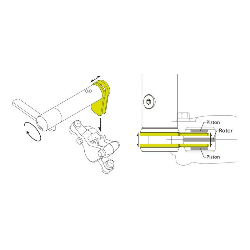 Durch symmetrische Bewegungen werden beide Kolben gleichzeitig in Position gebracht, bis sie bündig mit dem Bremssattel sind. Das Design stellt sicher, dass die Kolben gerade eingefahren und freigegeben werden, um Schäden an den umgebenden Elementen zu vermeiden.