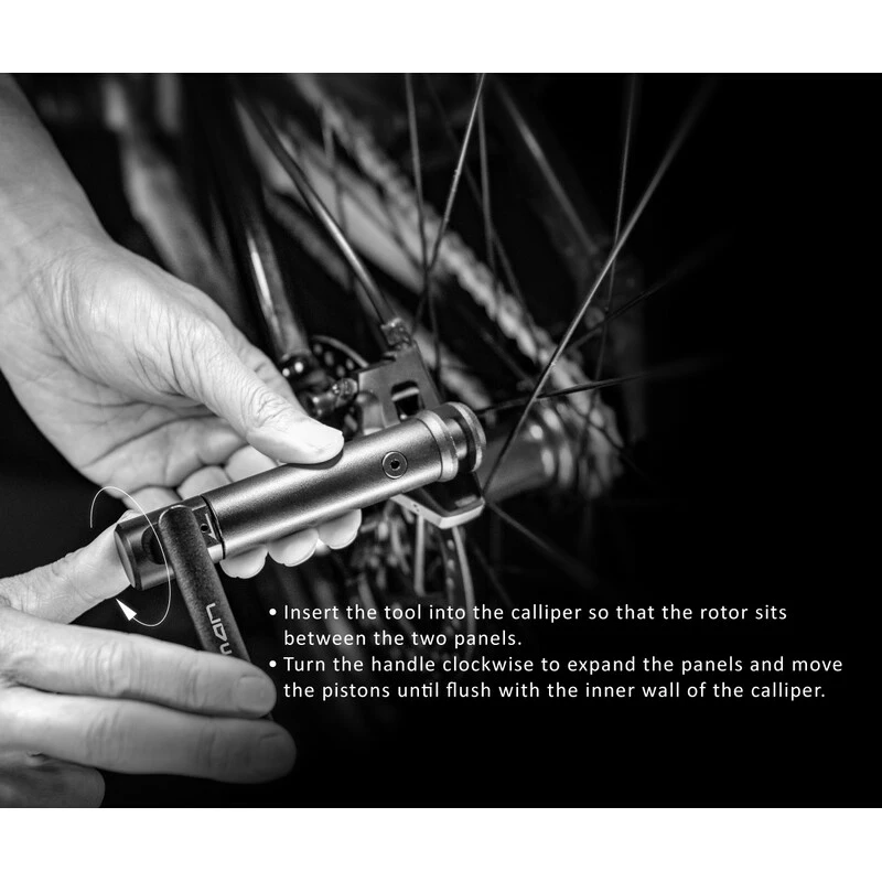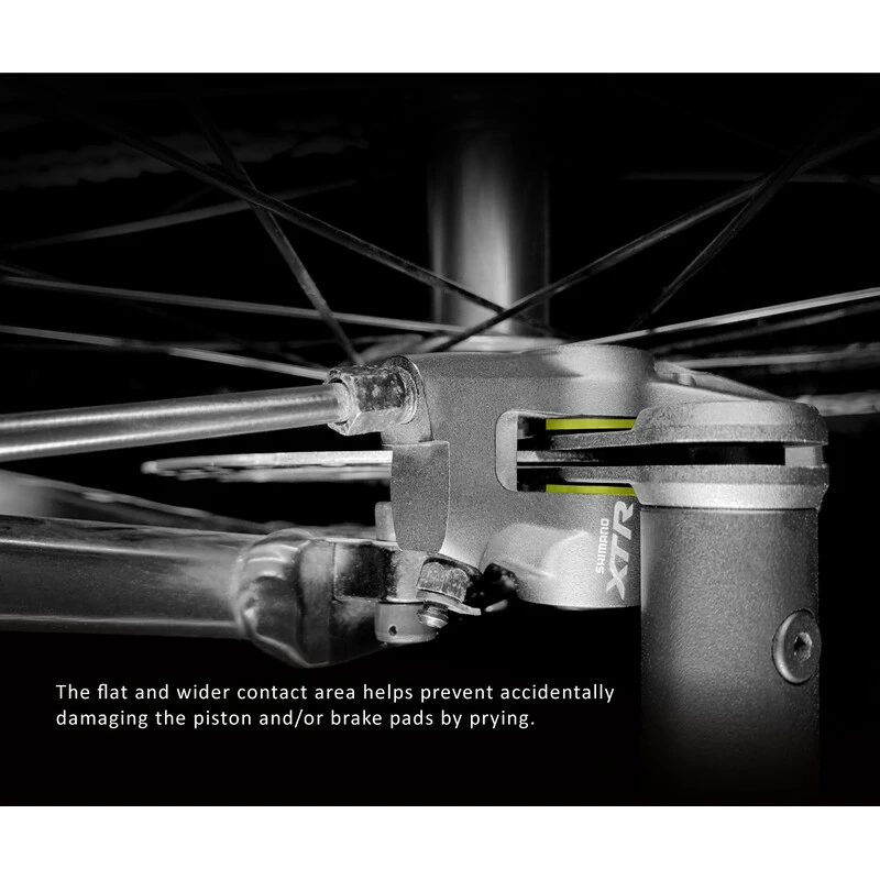 – Dieses Tool kann bei eingebautem Laufrad mit vorher demontierten Bremsbelägen benutzt werden.