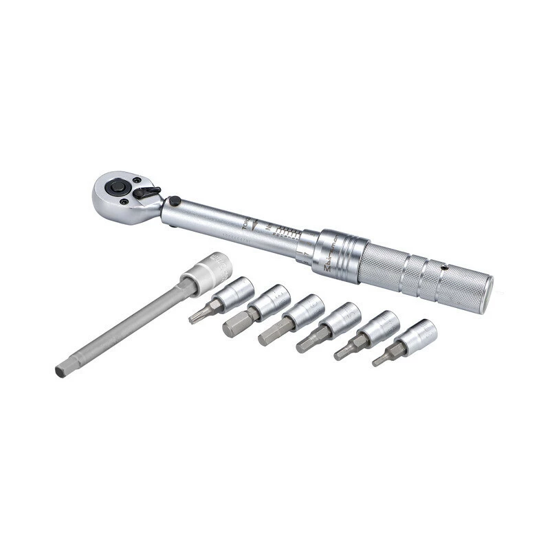 Hochwertiger, mechanischer Drehmomentschlüssel. Anzugsmoment in 0,1Nm Schritten fix einstellbar. Von 3-15Nm; inkl. Bits (3/4/5/6/8mm und T25) und Koffer.