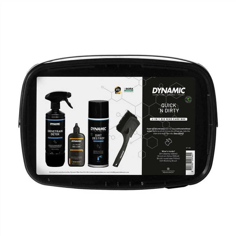 Reinige dein Fahrrad superschnell und einfach mit dieser Bio-Fahrradpflegebox. Beseitige den gesamten Schmutz mit Dirt Destroy, reinige deinen Antriebsstrang mit Drivetrain Detox und schmiere die Kette mit Bio Allround Lube. Die Box enthält die beliebte Dynamic Soft washing brush.Was ist drin?Dirt Destroy (400ml),Drivetrain Detox (500ml),Bio All round lube (100ml),Soft Washing Brush.Dirt Destroy:Der Dirt Destroy Schaumspray wurde entwickelt um dein komplettes Fahrrad (auch Kette, Kassette und Kurbel), mit oder ohne Wasser (E-Bike-Safe) zu reinigen und ist zudem biologisch abbaubar. Einfach sprühen, waschen und fertig.Bio Drivetrain Detox:Dieser Reiniger entfernt schnell und sicher Verschmutzungen, Öl, Wachs und Fett. Die umweltfreundliche Formel lässt sich leicht mit Wasser abspülen und ist der einzige Reiniger seiner Art, der keinerlei Gefahrensymbole aufweist!Bio All round Lube:Das Dynamic Bio All round Lube ist ein qualitativ hochwertiges Schmiermittel, welches Reibung in deinem Antriebssystem reduziert und Schaltvorgänge geschmeidiger macht. Seine ausgefeilte Rezeptur ist darüber hinaus optimiert worden, um bewegliche Teile gegen Wasser und Rostbildung zu schützen.Soft washing brush:Die sanfte Reinigungsbürste ist ideal zum Reinigen deines Fahrradrahmens und deiner Komponenten. Die spezifische Borstenstruktur der weichen Waschbürste ist für alle Bikes und Rahmenmaterialien geeignet. Diese Bürste ist für eine schnelle Reinigung konzipiert.