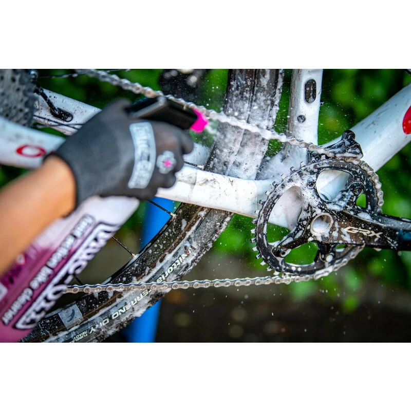 Rad mit klarem Wasser absprühen, Muc-Off Fahrradreiniger auf das gesamte Rad aufsprühen und 3-5 Minuten einwirken lassen. Hartnäckigen Schmutz mittels einer Bürste lösen und danach mit klarem Wasser abspülen.