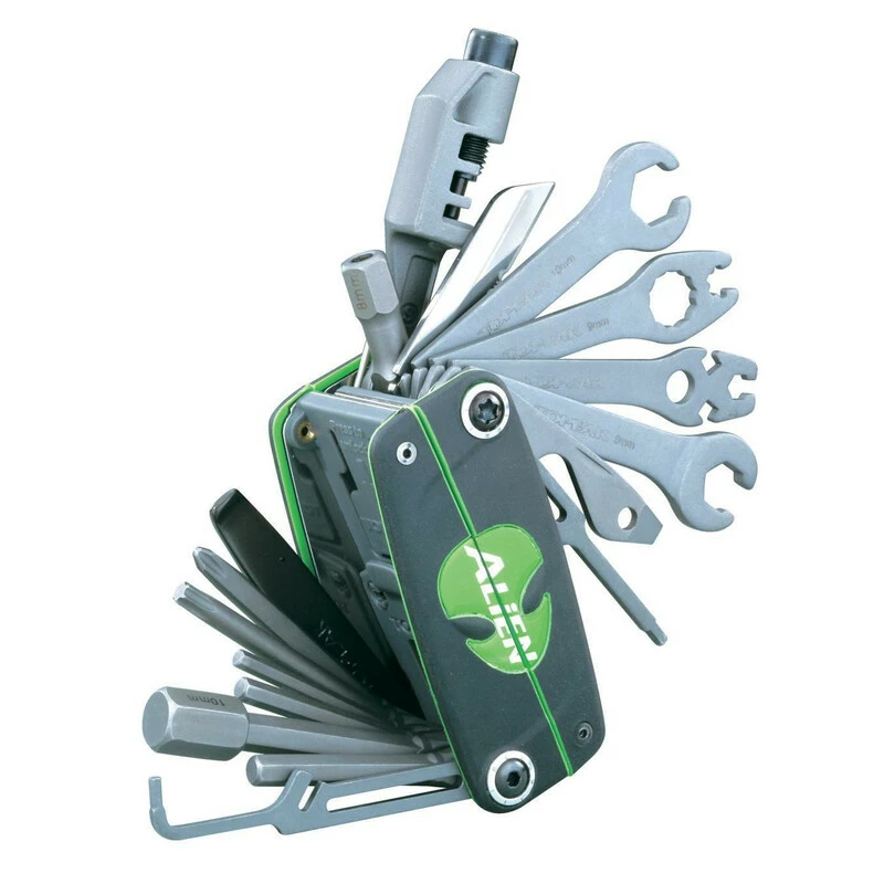 Das Topeak Alien III Mini-Tool bietet 25 hochwertige Werkzeuge bei nur 272g Gewicht um für jede Notlage gewappnet zu sein. Dank der neuen gepressten Edelstahl Schale bietet das Alien III noch mehr Haltbarkeit. Das Tool ist in der Mitte teilbar, so dass eine bequemere Nutzung der Werkzeuge möglich ist. Das Miniwerkzeug bietet folgendes Paket: