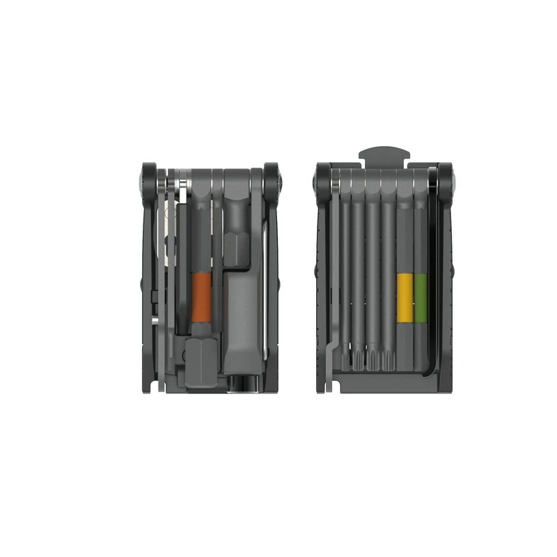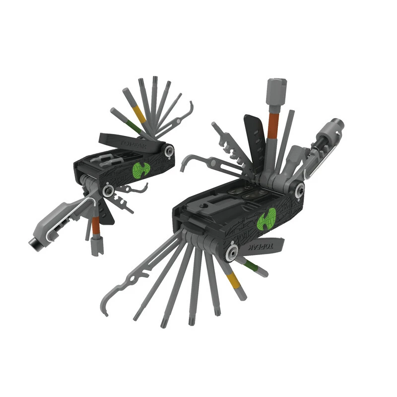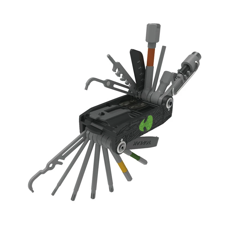 Das ALiEN™ X aus dem Hause Topeak ist die konsequente Weiterentwicklung des Kult-Tools ALiEN™. Im Klappmechanismus verbergen sich 34 clever integrierte Funktionen in Pro-Qualität. Neben verschiedenen Torx®-Schlüsseln verfügt das neue Multitool über eine Power Link-Zange für Single- und Multi-Speed Ketten. Das zweiteilige Design verbessert den schnellen Zugriff der einzelnen Werkzeuge und erhöht die Hebelwirkung während der Arbeit. In der mitgelieferten Nylontasche ist das Multifunktionswerkzeug gut geschützt startklar für die nächste grosse Tour.