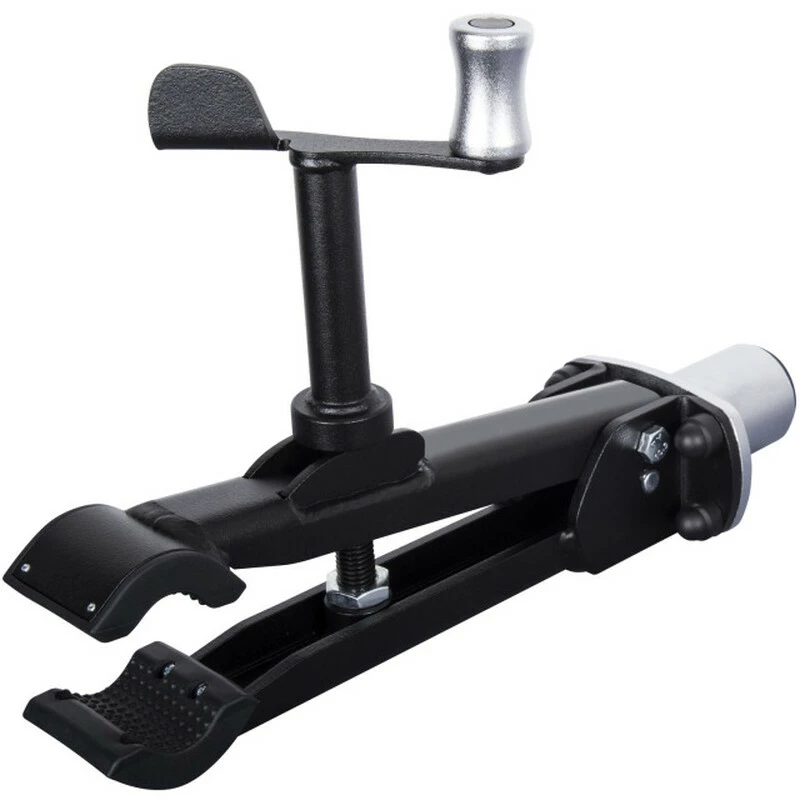 Mit der kompakten Klemme lassen sich auch die schwersten Räder gut halten. Durch die Rahmenkonstruktion des Spannfutters öffnen und schliessen die Klemmbacken parallel laufend. Damit wird das Rad schonend und sicher gegriffen. Aufgrund der runden Backenform verteilt sich die Klemmkraft gleichmässig am gesamten Umfang der Klemmfläche. Wegen der geringen Breite der Klemmbacken sind zum Klemmen lediglich 5 cm freie Sitzrohrlänge erforderlich. Das Spannfutter ist durch griffige austauschbare Gummibacken geschützt. Die Klemmvorrichtung wird durch einen ergonomisch geformten Drehgriff, mit dem auch die Klemmkraft präzise eingestellt werden kann, betätigt. Der Anbauadapter für diese Klemme ist austauschbar und passt zu Adaptern für Montageständer anderer Marken (Teile nicht im Lieferumfang).